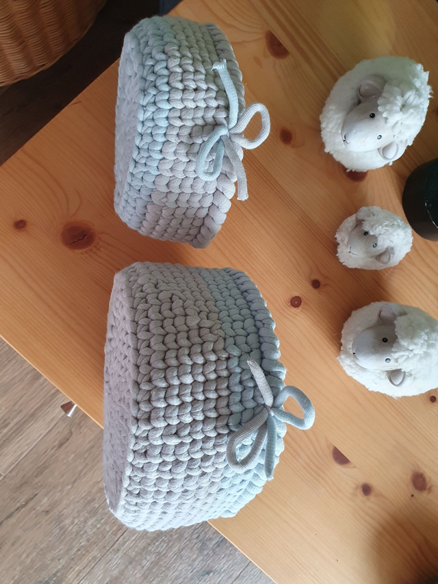 2 runde Körbe im Set im Pastellton grau hellblau.